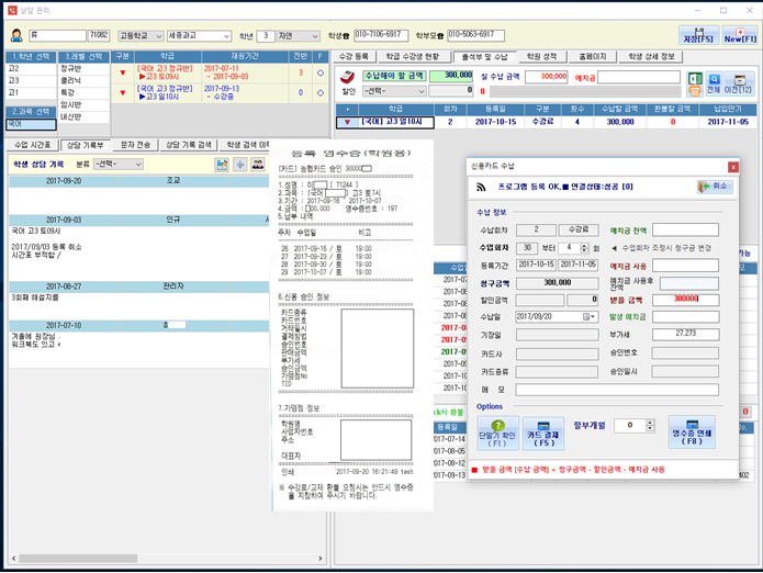 • 출석부, 시간표 기준으로 수강료 자동 산정 ( 기준일별로 금액 변경 가능 ) 되며, 전반시 수납 자동 반영, 예치금 처리, 각종 할인 등록 처리