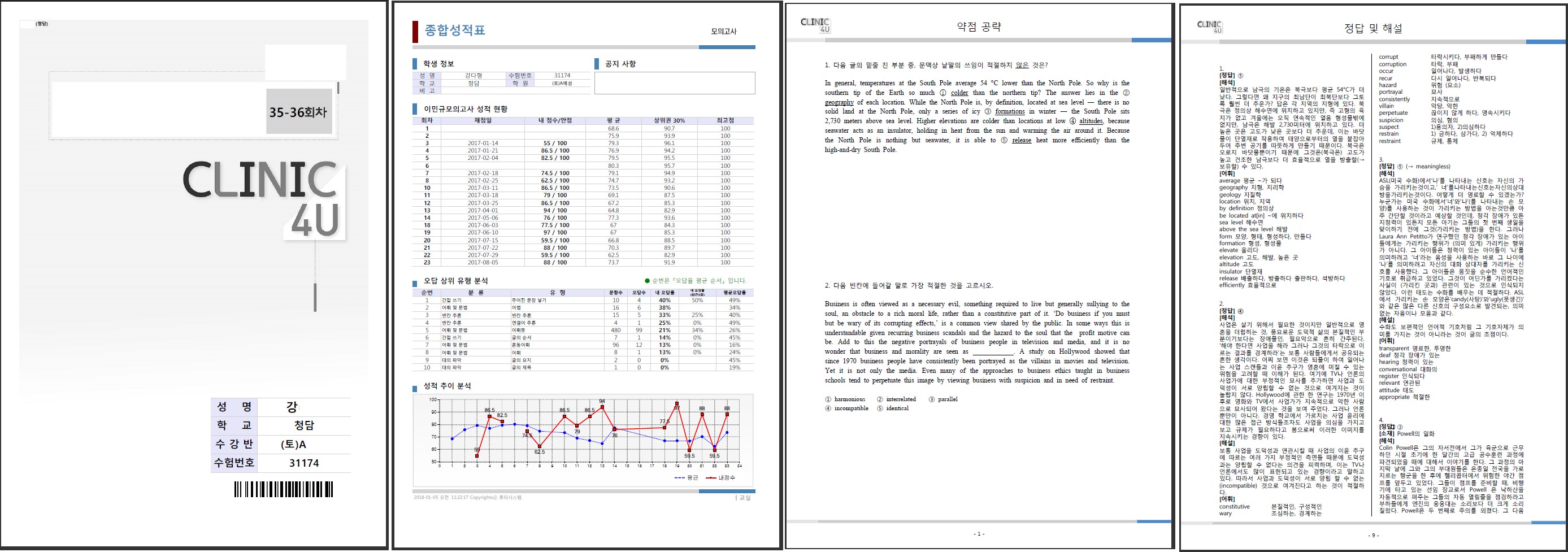 각 학생 별로 공부가 부족한 부분 혹은 많이 틀리는 영역을 난이도 분석하여, 학생별로 표지, 성적표. 약점 공략 문항들을 데이터베이스에서 선별하여 생성 인쇄 ( PDF, HWP 파일) 할 수 있습니다.
