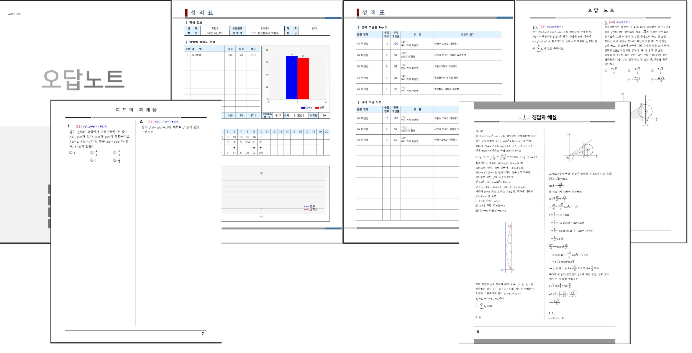 숙제 OMR을 채점하여, 학생별로 성적표, 오답노트, 피드백과제물 ( 틀린 문항에 대한 동형 문항 제시 )을 데이터베이스에서 자동 선별하여 생성 인쇄할 수 있습니다.
